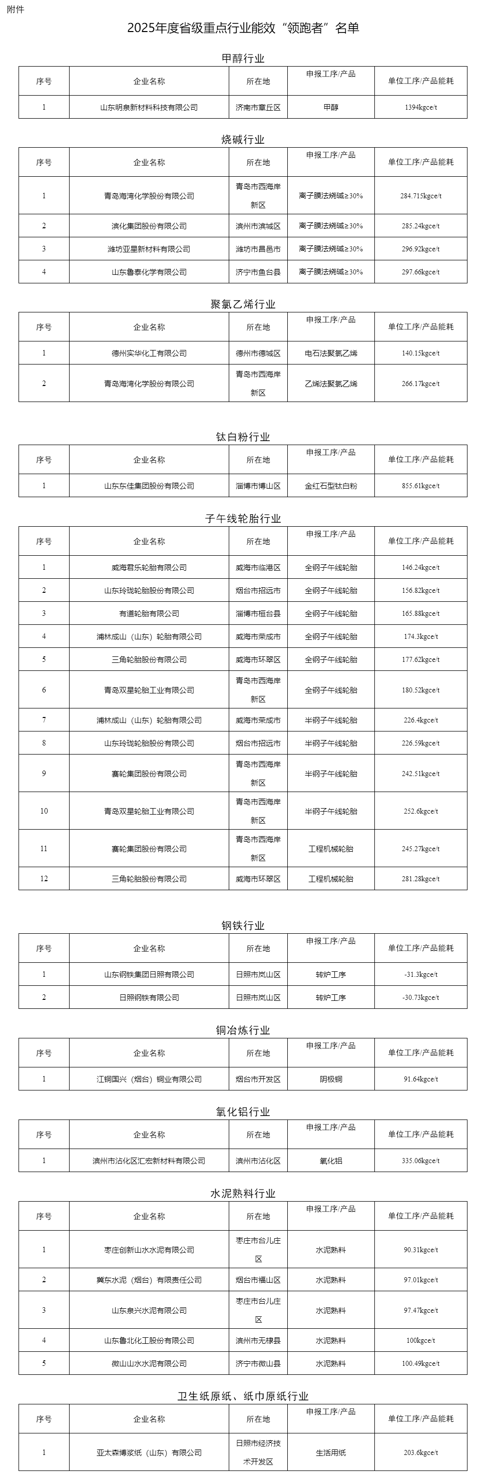 山东省2025年度重点行业能效“领跑者”名单