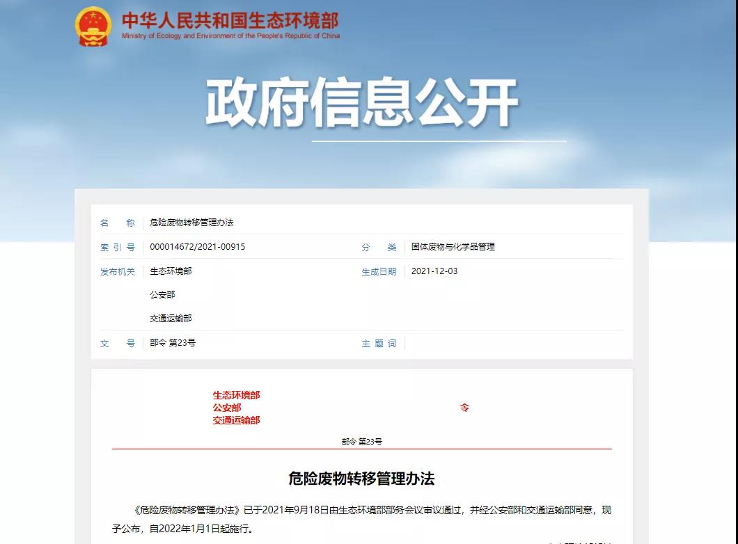 2022年1月1日起施行!生态环境部出台《危险废物转移管理办法》