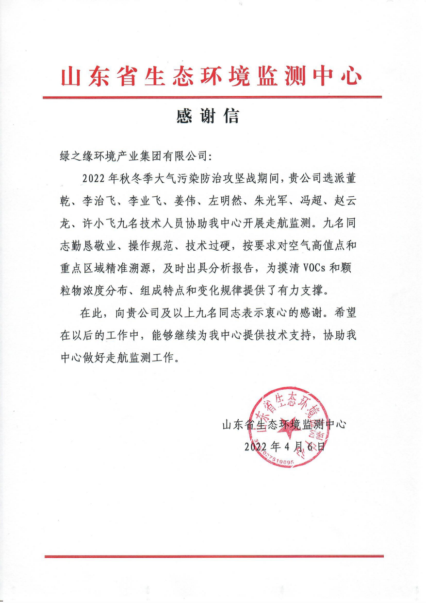 绿之缘环境产业集团助力山东省大气污染综合防治 ——山东省生态环境厅生态环境监测中心致信感谢