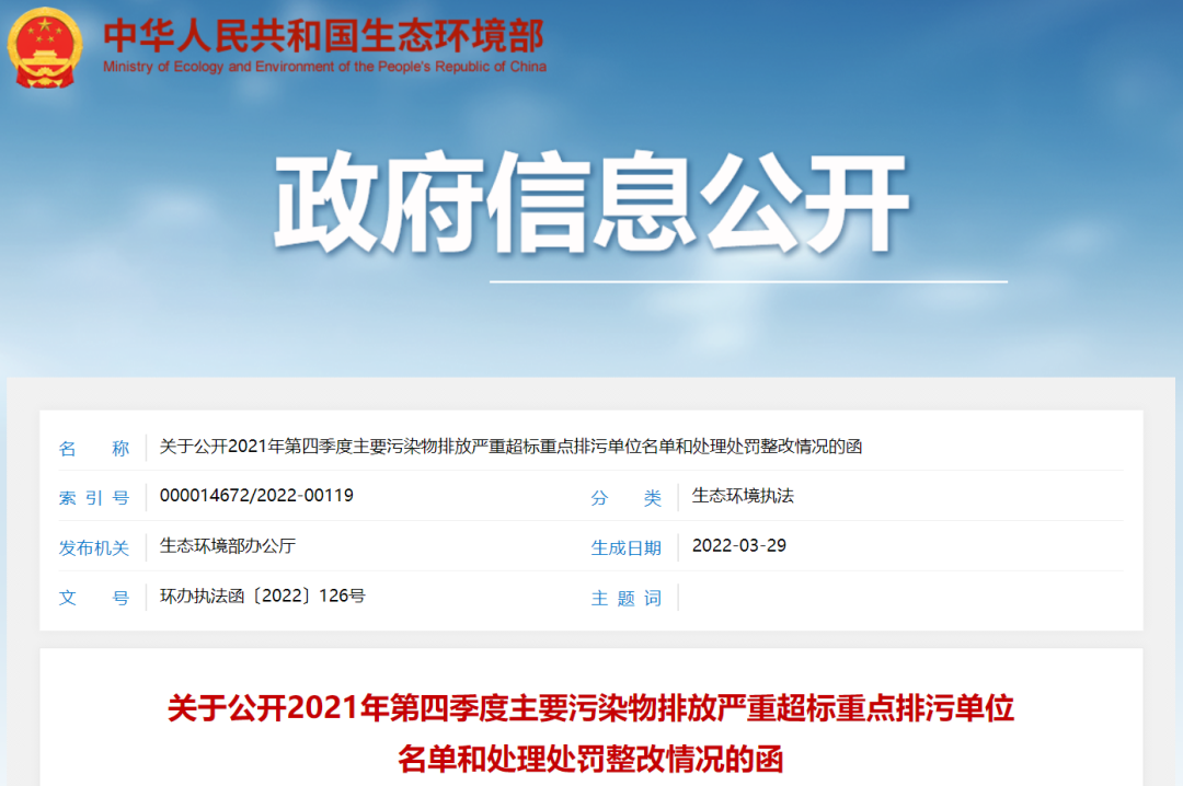 生态环境部公开2021年第四季度污染物排放严重超标重点排污单位和处理处罚整改情况