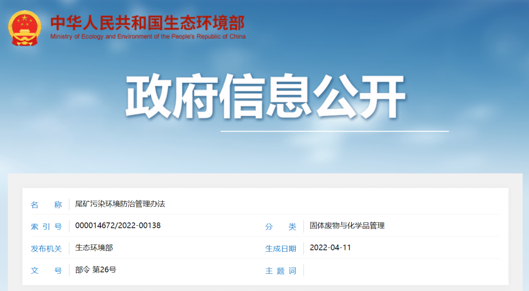 生态环境部发布《尾矿污染环境防治管理办法》
