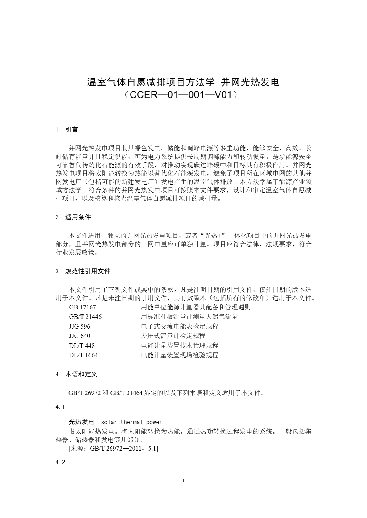 温室气体自愿减排项目方法学 并网光热发电(CCER-01-001-V01)