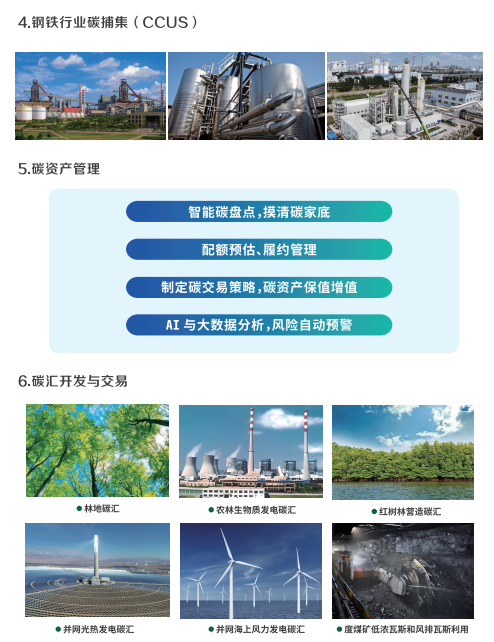 | 包含碳规划、碳咨询、碳资产管理、碳汇开发与碳交易、碳捕集、智碳平台运维。 |