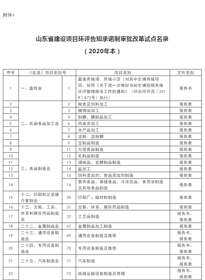 附件:1.山东省建设项目环评告知承诺制审批改革试点名录(2020年本)