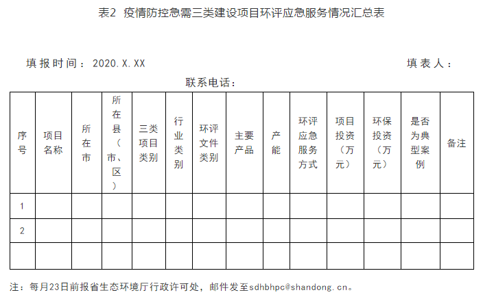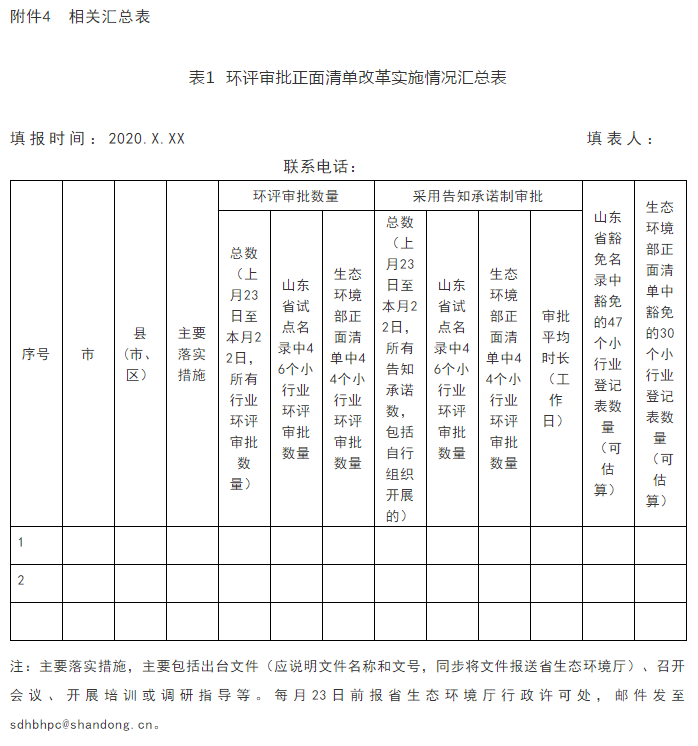 (二)各市环评审批部门要对实施情况和成效进行动态监测和跟踪分析,于每月23日前将《环评审批正面清单改革实施情况汇总表》《疫情防控急需三类建设项目环评应急服务情况汇总表》(见附件4)报省生态环境厅行政许可处。