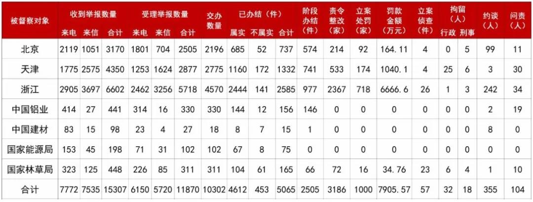有关省(市)、部门和中央企业高度重视督察工作,将加强督察配合、推动边督边改作为提高政治站位、坚决贯彻落实习近平生态文明思想的重要内容,党政主要领导通过督察动员、现场督办、召开专题会议,以及加强约谈问责和立案查处等方式,大力推动督察配合和整改落实。截至10月1日,各督察组共收到群众举报15307件,受理有效举报11870件,经合并重复举报后转办10302件。已办结5065件,阶段办结2505件;立案处罚1000家,罚款7905.57万元;立案侦查57件,拘留50人;约谈党政领导干部355人,问责104人(详见附表)。