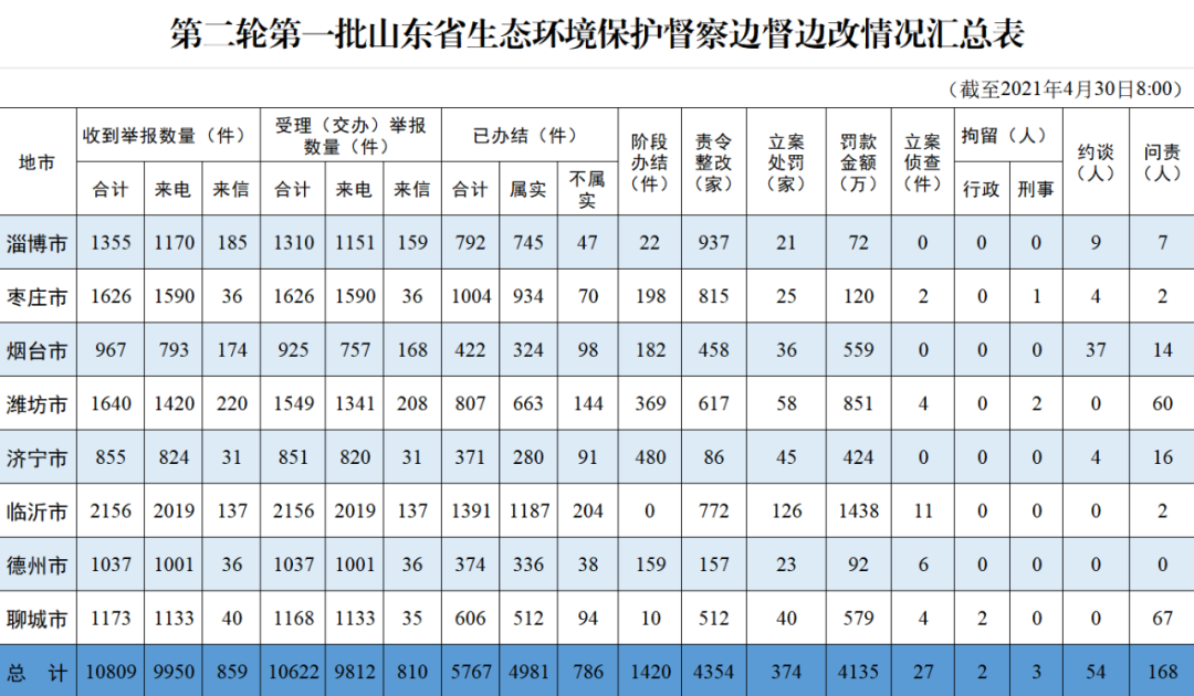 截至4月30日上午8:00,8个督察组共收到群众来电、来信举报10809件,受理有效举报10622件,其中,淄博市1310件、枣庄市1626件、烟台市925件、潍坊市1549件、济宁市851件、临沂市2156件、德州市1037件、聊城市1168件。被督察市已办结5767件,其中立案处罚374家,罚款4135万元,立案侦查27件,拘留5人,约谈54人,问责168人(详见附表)。