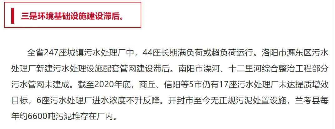 河南:洛阳市瀍东区污水处理厂新建污水处理设施配套管网建设滞后。南阳市溧河、十二里河综合整治工程部分污水管网未建成。