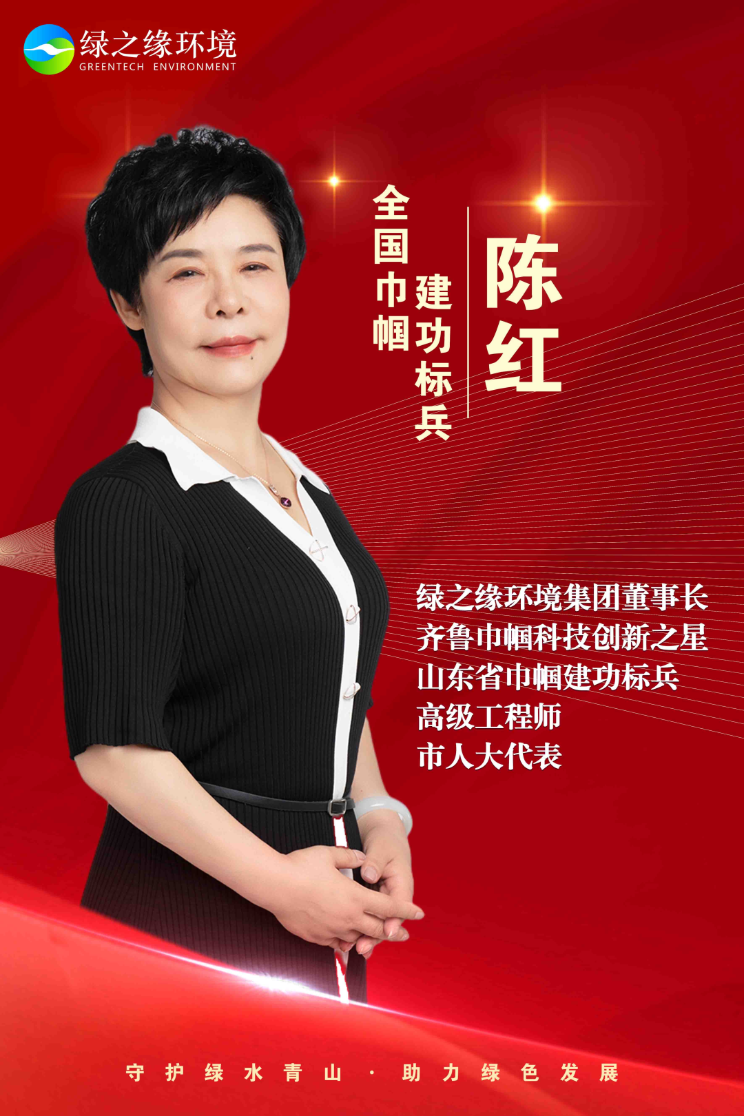 陈红,绿之缘环境集团董事长、民革党员、高级工程师、“齐鲁巾帼科技创新之星”、“山东省巾帼建功标兵”、日照市人大代表。